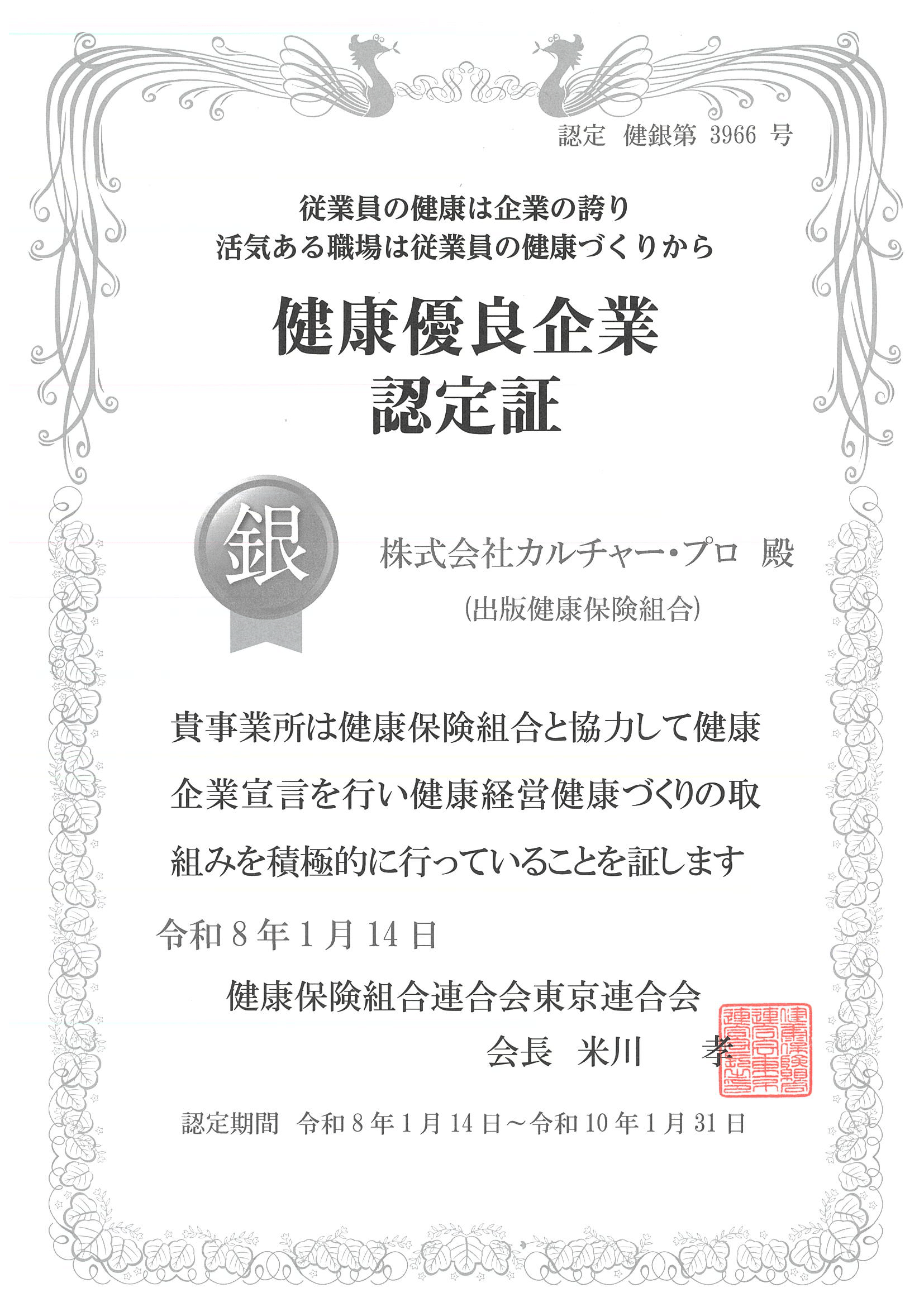 この度、当社は、健康保険組合連合会東京連合会が主催する「健康企業宣言」において、積極的な健康経営への取り組みが認められ、「健康優良企業(銀の認定)」に認定されました。